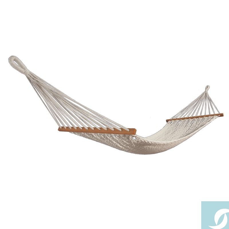 Hamaca de red doble con nudos de 100% algodón. Fabricada con cuerda de algodón de 3mm. Ancho (barra): 80 cms. Largo hamaca (de barra a barra): 210 cms. Largo total hamaca (mosquetón a mosquetón): 300 cms. Hamaca de gran resistencia y durabilidad en el exterior.
