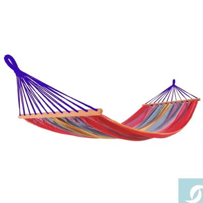 Hamaca de tejido extra sin flecos de 100% algodón. Diseño a rayas. Ancho (barra): 78 cms. Largo hamaca (de barra a barra): 230 cms. Largo total hamaca (mosquetón a mosquetón): 340 cms. Ancho hamaca (total): 130 cms. Hamaca de gran resistencia y durabilidad en el exterior.