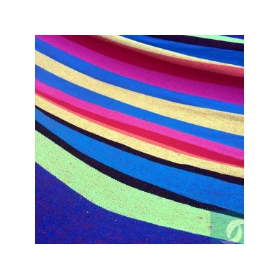 Hamaca de tejido extra sin flecos de 100% algodón. Diseño a rayas. Ancho (barra): 79 cms. Largo hamaca (de barra a barra): 230 cms. Largo total hamaca (mosquetón a mosquetón): 340 cms. Ancho hamaca (total): 130 cms. Hamaca de gran resistencia y durabilidad en el exterior.