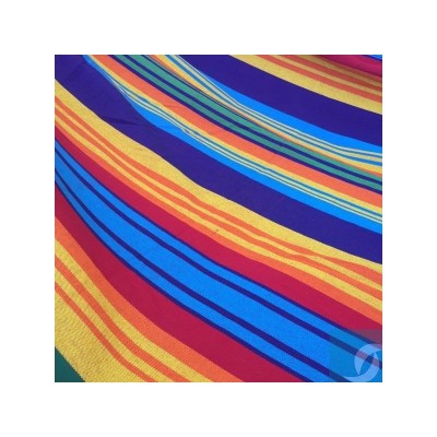 Hamaca de tejido extra sin flecos de 100% algodón. Diseño a rayas. Ancho (barra): 79 cms. Largo hamaca (de barra a barra): 230 cms. Largo total hamaca (mosquetón a mosquetón): 340 cms. Ancho hamaca (total): 130 cms. Hamaca de gran resistencia y durabilidad en el exterior.