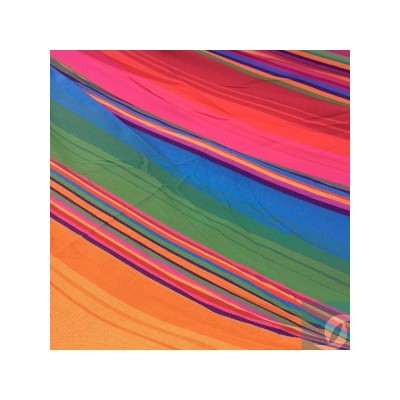 Hamaca de tejido extra sin flecos de 100% algodón. Diseño a rayas. Ancho (barra): 78 cms. Largo hamaca (de barra a barra): 230 cms. Largo total hamaca (mosquetón a mosquetón): 340 cms. Ancho hamaca (total): 130 cms. Hamaca de gran resistencia y durabilidad en el exterior.