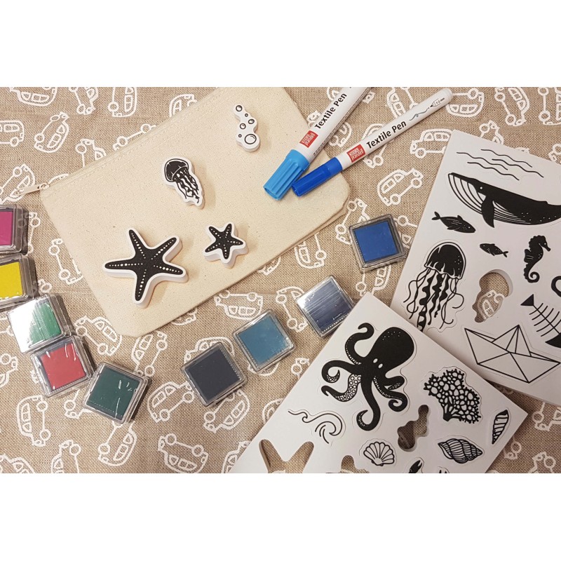 Disfruta decorando tu neceser con el mar como motivo. Kit compuesto por dos laminas de sellos de mar, pack de 9 tientes textiles, dos rotuladores azules y el neceser.