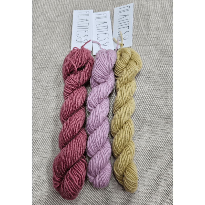 Pack de 3 mini madejas de lana gruesa teñidas a mano en tonos suaves y naturales: vainilla, terracota y lila. Cada madeja contiene aproximadamente 25 metros y 4,5 gramos. Estas lanas están pensadas para punch needle, bordado, telar o proyectos textiles de pequeño formato que busquen armonía y calidez.
