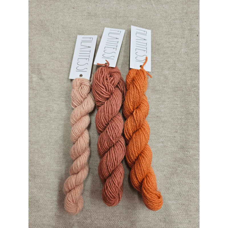 Pack de 3 mini madejas de lana gruesa teñidas a mano en tonos terrosos y cálidos: salmón suave, naranja vibrante y camel natural. Cada madeja tiene unos 25 metros y 4,5 gramos aproximadamente. Perfectas para bordado, punch needle, telar o cualquier proyecto creativo de pequeño formato que busque calidez y armonía.