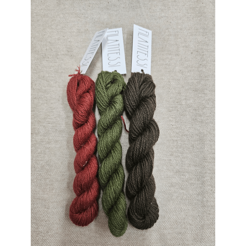 Pack de 3 mini madejas de lana gruesa teñidas a mano en tonos inspirados en la naturaleza: verde fresco, oliva seco y marrón tierra. Cada madeja contiene aproximadamente 25 metros y 4,5 gramos, ideales para punch needle, telar, bordado o detalles decorativos con un aire orgánico y sereno.