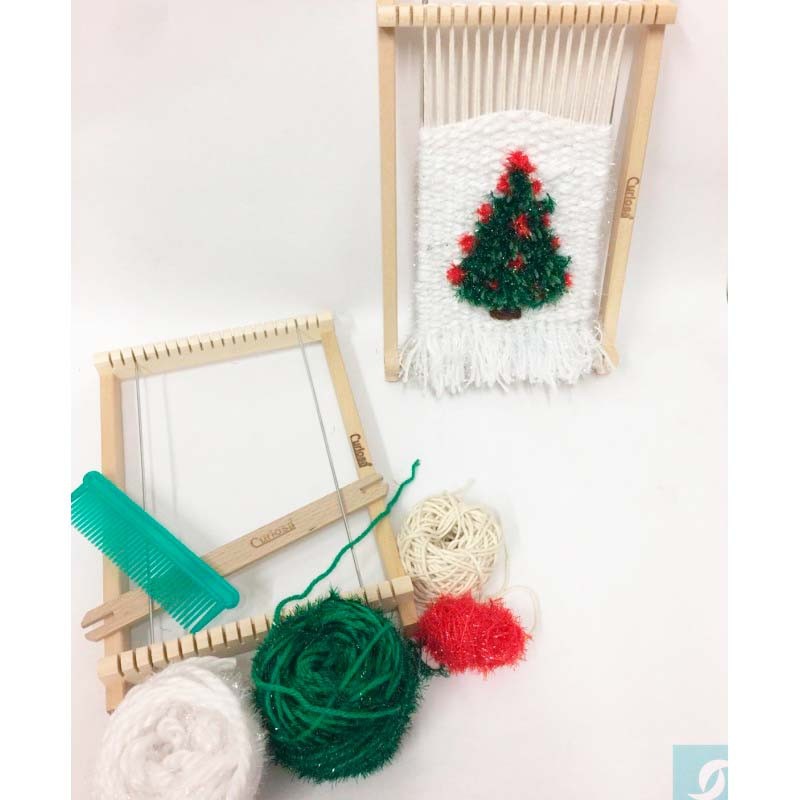 Kit de pino de navidad incluyendo el bastidor de 17cm de la marca curiosa y de gran calidad y tres madejas de lana Rubí en rojo, verde y blanco. También incluye la lanzadera, el peine y las guías laterales.