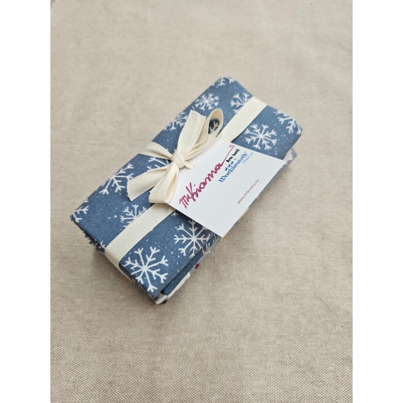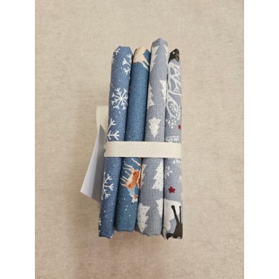 Este pack de 4 telas navideñas Westfalenstoffe (48×48 cm) ofrece un aire invernal elegante en tonos azules y grises. Incluye copos de nieve, renos, árboles blancos y ciervos.