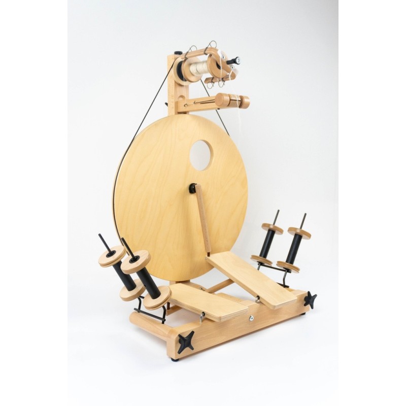 Esta rueca viene con pedal doble, freno de tensión escocés y el volante Clasico.